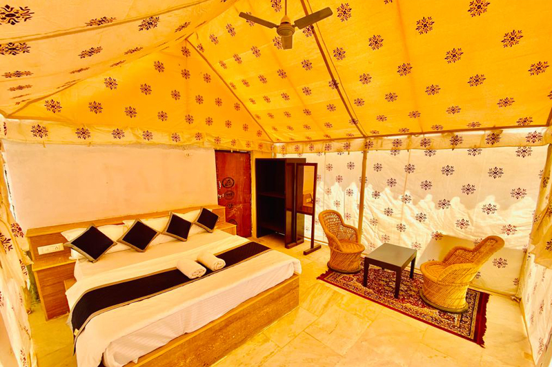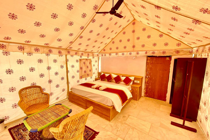We provide fully equipped tentage accommodation with toilet facilities, electricity, thus bringing home away from home experience to you. Be close to nature, enjoy the rajasthani heritage in our elegantly built tents having centre room, verandah, toilets with all modern facilities including 24 hrs running water. To add to your experiences, joyous and gaiety, we have an open air restaurant. At "Smart Desert Camp Jaisalmer" we provide swiss tent accommodation with attached bathroom and 24 hours running hot & cold water. We have beautifully made our tents with a good quality of cloth keeping in mind the severe chilling of the great thar deset and locally hand block printed, covering 14x14 center room, 14x7 verandah, 14x7 attached bathroom.